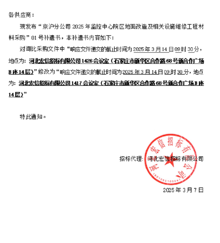 京滬分公司2025年監(jiān)控中心院區(qū)地面改造及相關(guān)設(shè)施維修工程勞務(wù)合作 01號補(bǔ)遺書