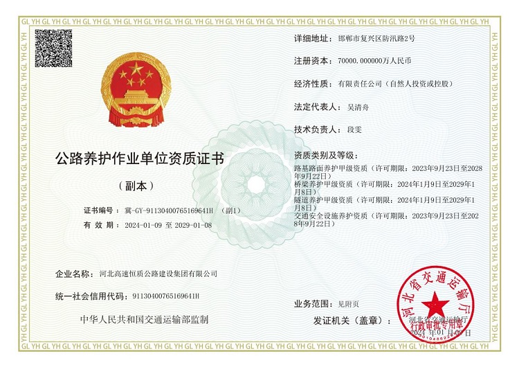 公路養(yǎng)護(hù)作業(yè)單位資質(zhì)證書